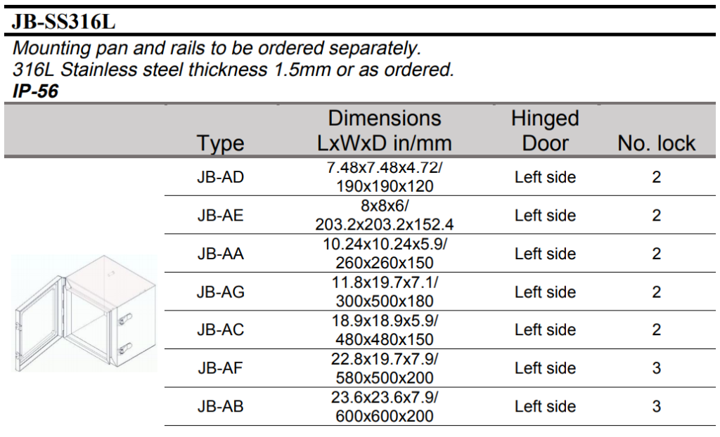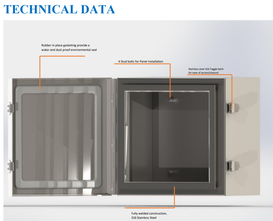 • Stainless steel, AISI 316L, is suitable for outdoor use (the use of a rain shelter is recommended) since it has excellent corrosion resistance and resistance to UV radiation. This material is suitable for demanding industrial environments – for example, in the food industry and Oil & Gas industry. Additionally, stainless steel is very practical as it needs scarcely any maintenance. Customizing is, however, more difficult than with painted steel.