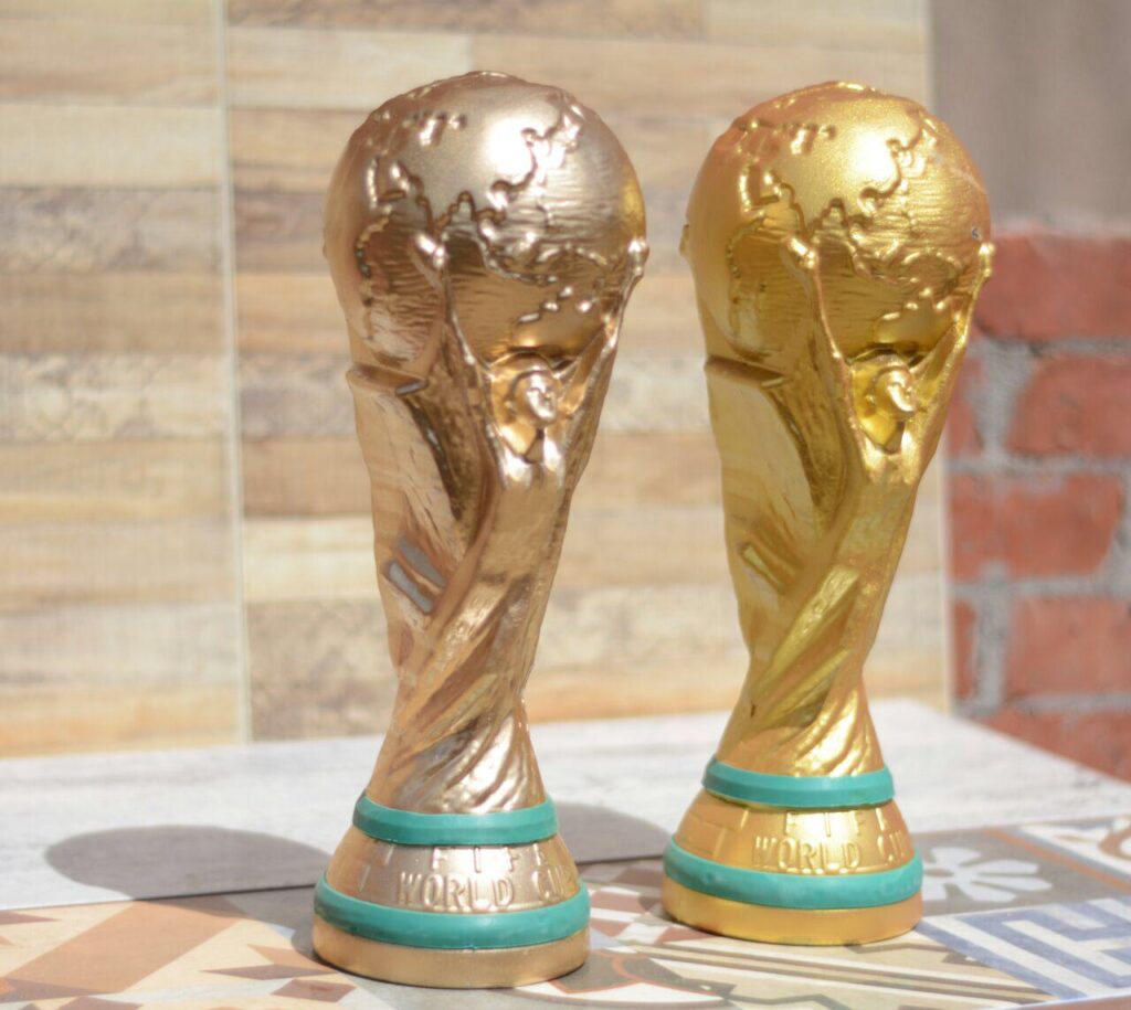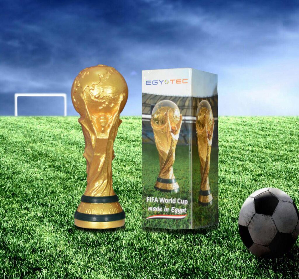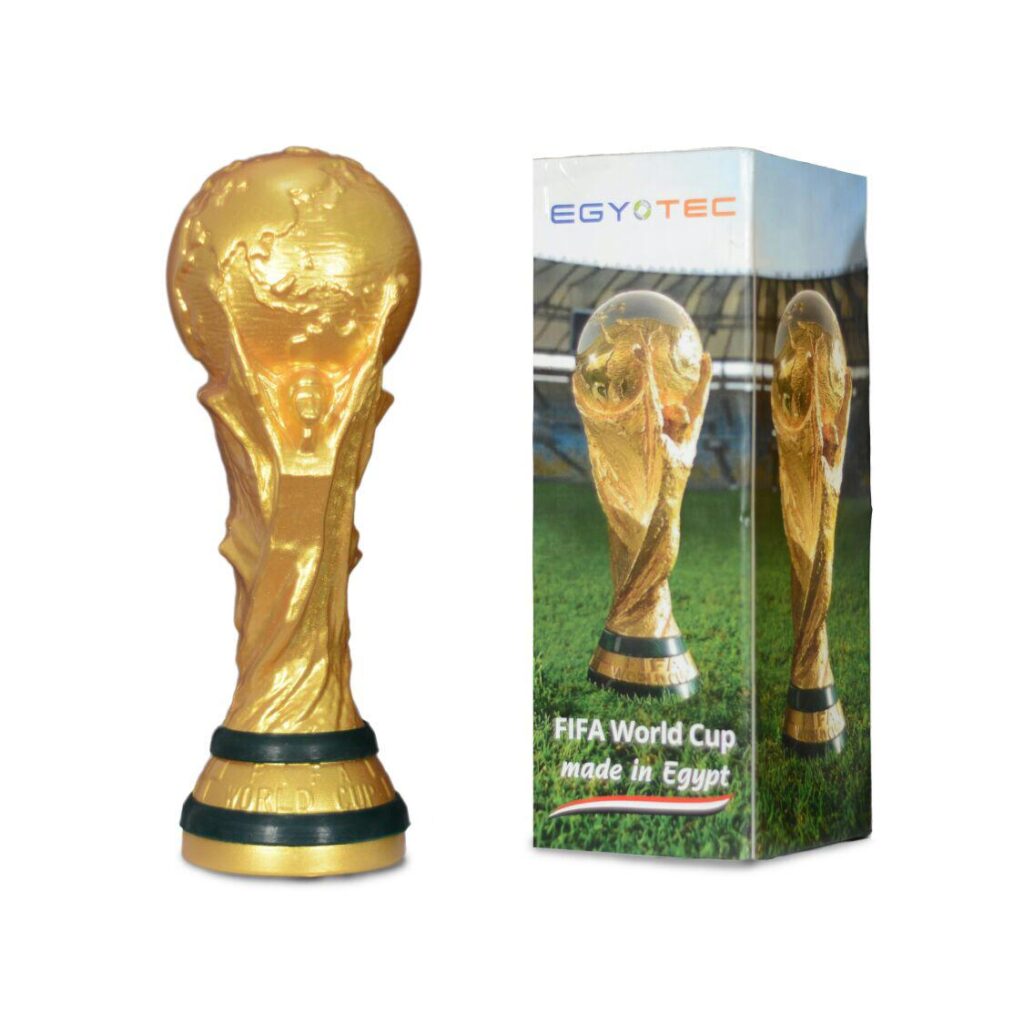 World Cup replica is manufactured from rigid antishock PVC with height 35 cm and maximum diameter 13 cm and electrostatically painted to three grades of gold: bronze, yellow and shiny.